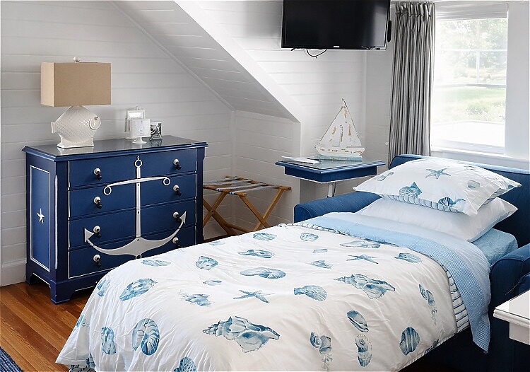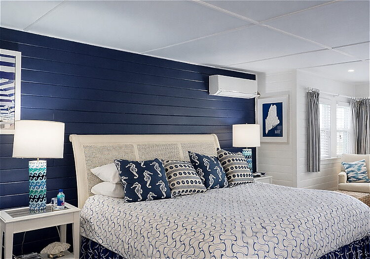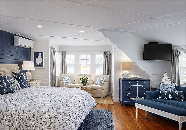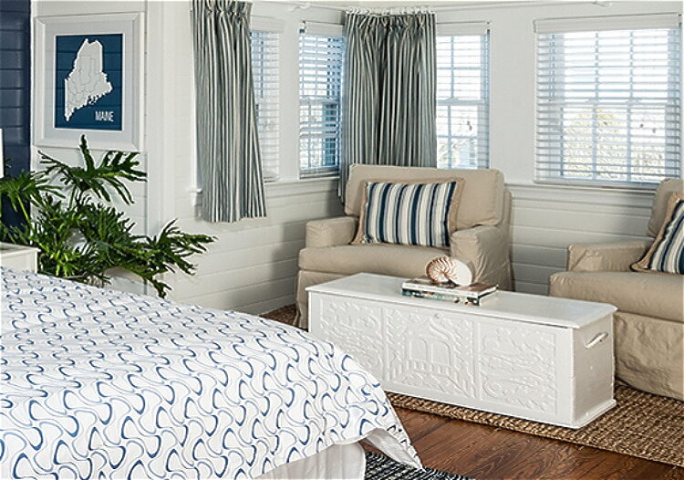 A guest favorite, this elegant second-floor suite features two comfortable sitting areas, lovely distant beach and water views, and serene marine-inspired décor. With a king bed and en-suite bath with a tub, it’s an ideal retreat for guests who enjoy space, comfort, and classic Maine charm.