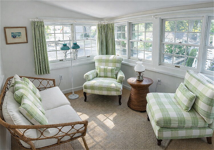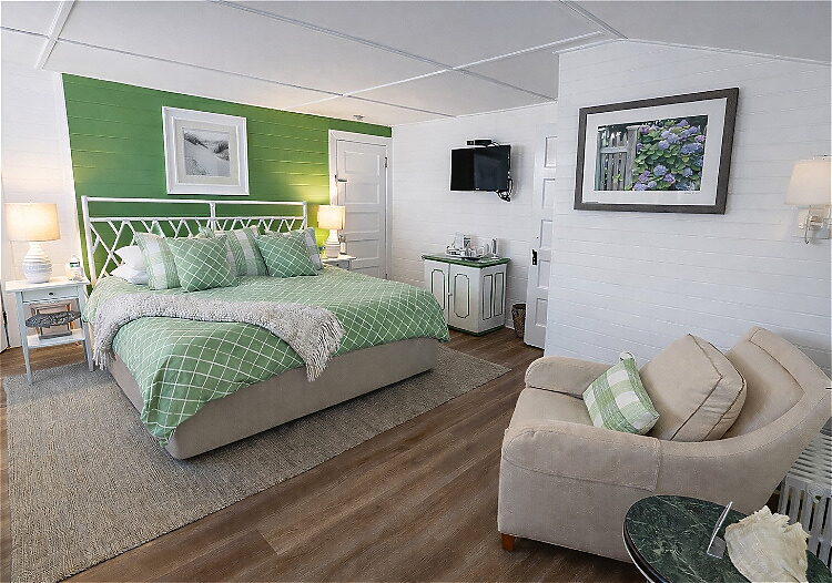 Filled with quintessential Maine charm, this inviting second-floor suite offers shiplap walls, beautiful garden décor, and a generous layout. A private enclosed porch overlooks the gardens, creating the perfect space to relax, read, or enjoy time together.The suite includes a king bed and an en-suite bathroom with a walk-in shower.