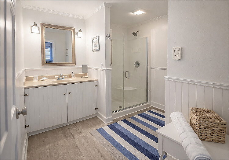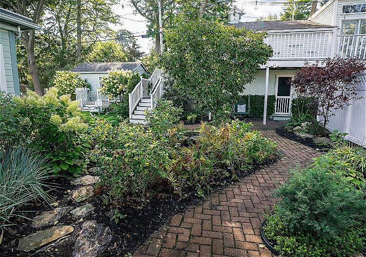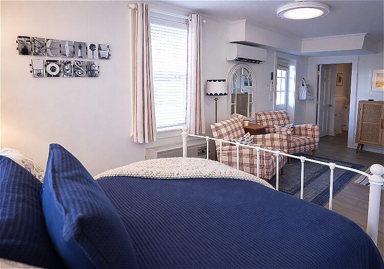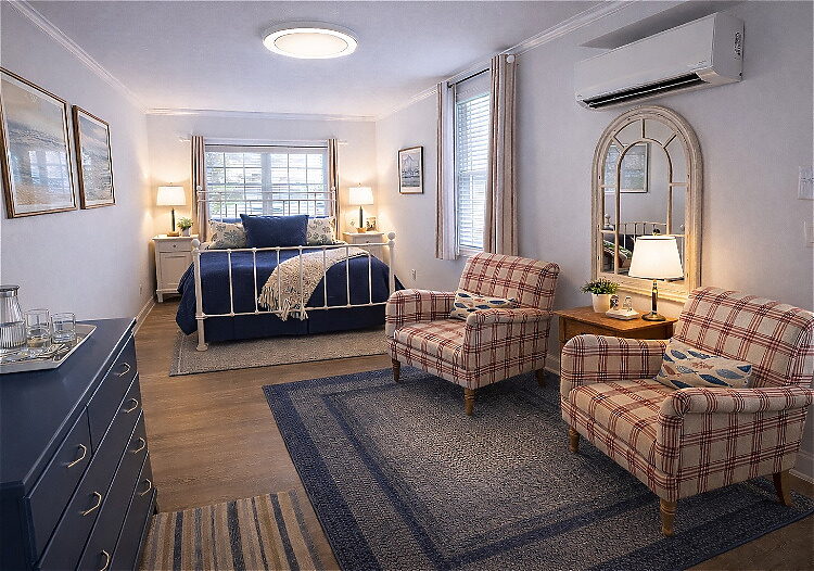 This first-floor Carriage House room blends comfort and convenience with a fresh, inviting design and a cozy sitting area for two. Situated beside the pond and gardens and just a short walk to parking, it’s perfect for guests seeking serenity and easy access without stairs. The room includes a queen bed and a spacious en-suite bath with a large walk-in shower.