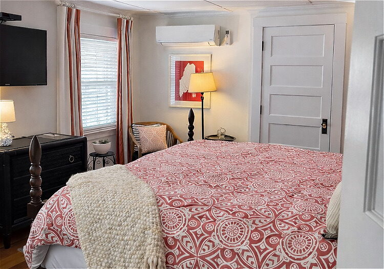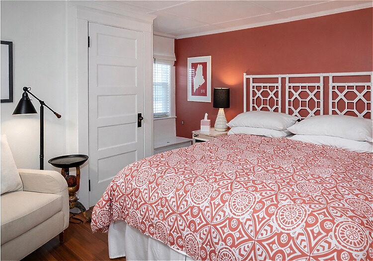 Located on the second floor of the main house, this delightful room offers vibrant coral décor that fills the space with warmth and light. Cozy and inviting, it’s a favorite with repeat guests and includes a king bed and an en-suite bath with a full tub.