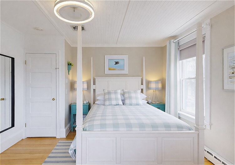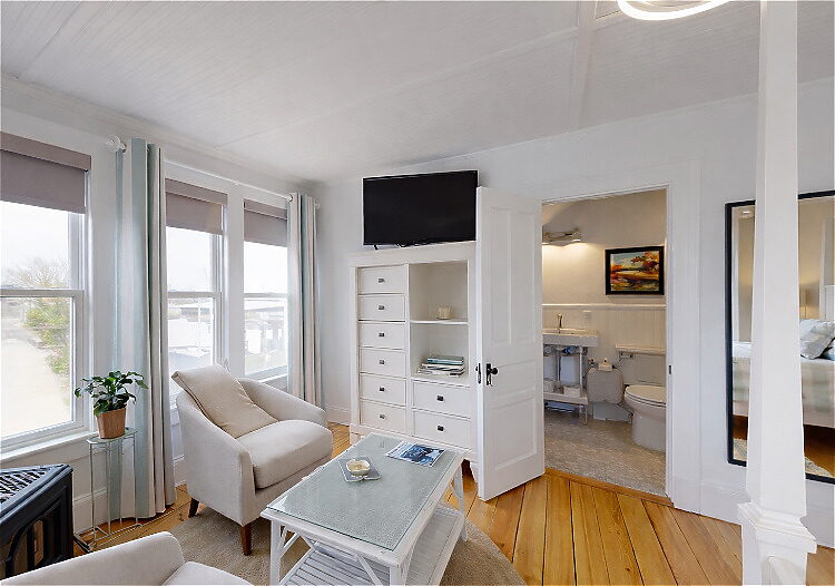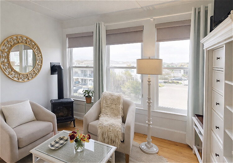 Situated on the second floor of the main inn, the Boothbay Room offers a light-filled retreat with relaxed coastal elegance and views of Ogunquit Beach. The room features original wide-plank pine flooring, four large windows with blackout shades, a deluxe queen bed, cozy sitting area for two, gas stove, and a renovated private bath with a walk-in shower.