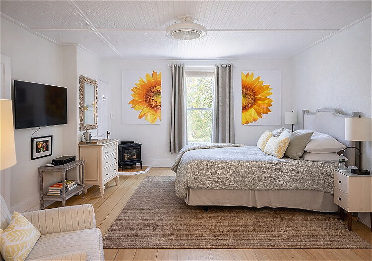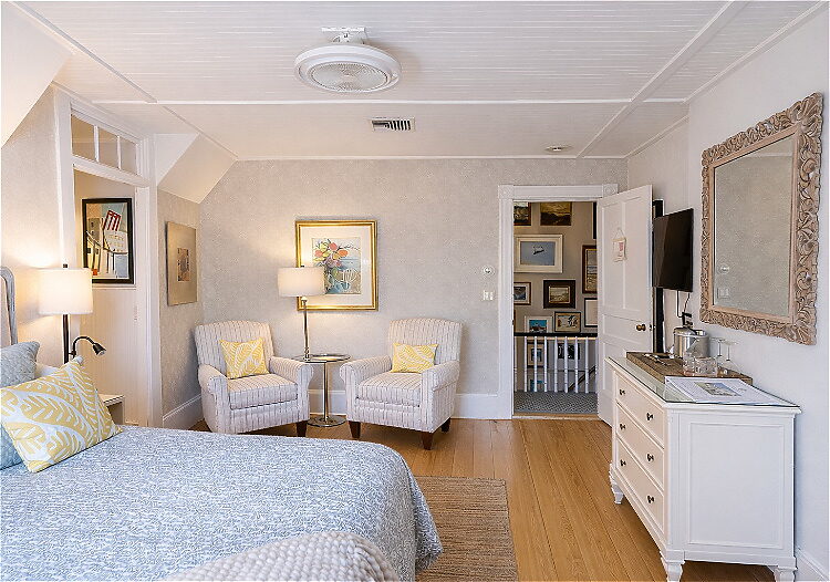 Situated on the second floor of the main inn, the Rockport Room blends coastal and garden-inspired elegance with northeast-facing views of Ogunquit Beach. The room features original wide-plank pine flooring,, a deluxe queen bed, cozy sitting area for two, gas fireplace, and a renovated private bath with a walk-in shower.